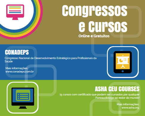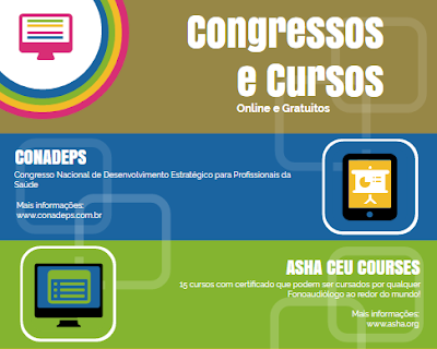 Há aproximadamente 15 dias atrás divulguei os cursos gratuitos e online da ASHA que é uma associação renomada de fonoaudiólogos dos EUA (Reveja o post). Hoje a dica é para o CONADEPS, Congresso Nacional de Desenvolvimento Estratégico para Profissionais da Saúde, que acontecerá entre os dias 6 e 12 de junho de 2016. A proposta do congresso é permitir ao profissional da saúde criar novas estratégias, ajudar em sua atuação profissional e a conquistar maior reconhecimento. A inscrição é online e o congresso é totalmente gratuito. Mais informações diretamente no site: (http://www.conadeps.com.br/