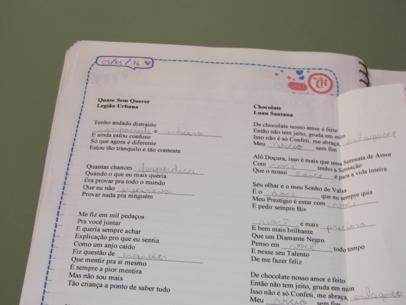 Trazer para a terapia atividades que o paciente gosta é uma forma de envolve-lo mais no processo terapêutico e certeza de um maior engajamento! A atividade para a sessão que elaborei tinha o seguinte raciocínio clínico: selecionei duas músicas, uma conhecida pela paciente (Música: Chocolate, do Luan Santana), e outra desconhecida por ela (Música: Quase sem querer, do Legião Urbana), sendo estas duas músicas com uma “velocidade” mediana, nem tão rápida, em tão lenta. Várias sessões anteriores essa paciente passou por estimulação ortográfica com palavras com CE/CI (tarefas com apoio visual e uso da memória lexical ortográfica) no qual está paciente apresentou domínio na escrita em atividades controladas. A atividade de completar as músicas foi para automatizar a escrita das palavras e seus derivados escritos com CE/CI, que anteriormente aconteciam com SE/SI. As músicas foram acrescidas de ruído branco bilateralmente para reforçar o treino da habilidade de fechamento auditivo.
