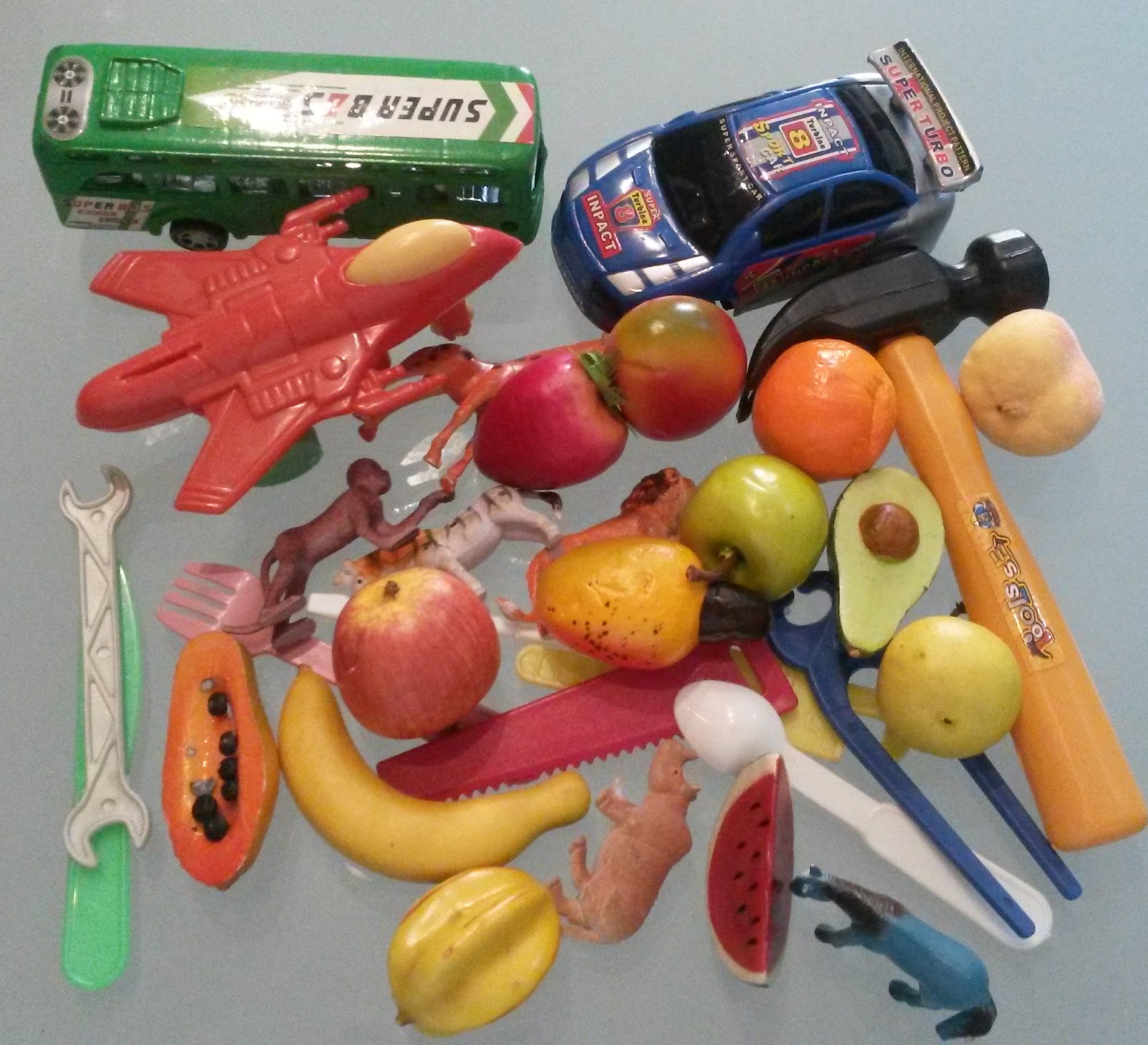 Materiais: Miniaturas de alimentos, animais, meios de transporte e etc. As miniaturas podem ser substituídas por figuras selecionadas pelo terapeuta.